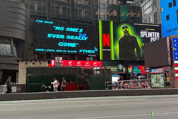 So some entrepreneurial Ben Solo heads are taking matters into their own hands. Last Thursday, a group of fans paid for a plane to fly over Walt Disney Studios in Burbank with a banner that read “Save The Hunt for Ben Solo.” And then a billboard popped up at 1500 Broadway in New York City with the message “For Adam. No one’s ever really gone. Hope lives. Ben is alive! #THBS.”